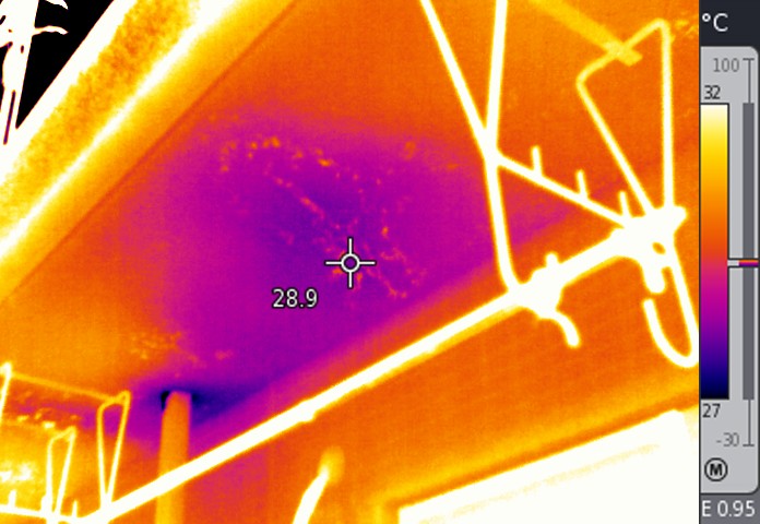 ベランダ下天井部分に雨水の影響による異常反応が見られました。