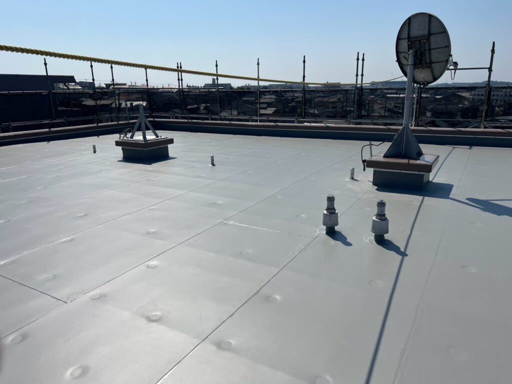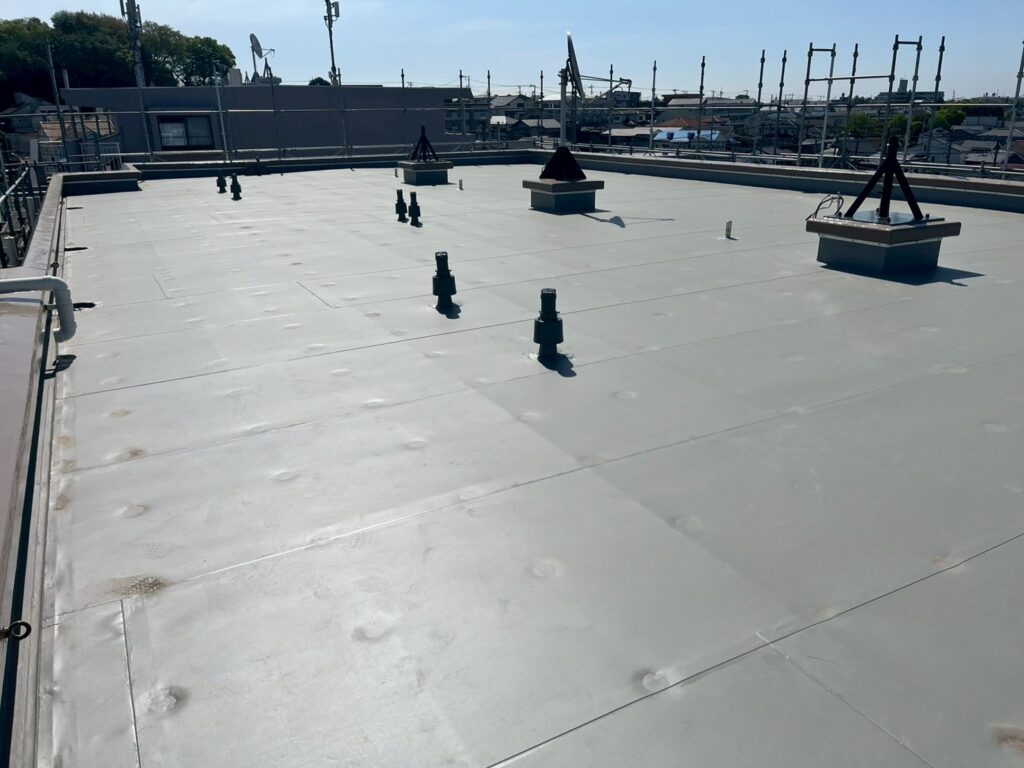 屋上防水工事では、耐久性・防水性能ともに優れた塩ビシート機械固定工法を採用。